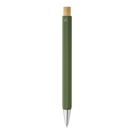 Sześciokątny długopis z recyklingowanego aluminium z bambusowym przyciskiem i chromowanymi elementami. Z niebieskim wkładem.