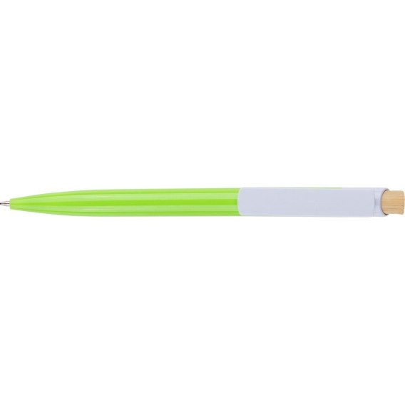 Długopis, bambusowy przycisk, metalowy klips, wkład w niebieskim kolorze, ikona recyklingu na produkcie, wystarcza na ok. 600 m pisania, produkt wykonany z ABS z recyklingu, aluminium i bambusa