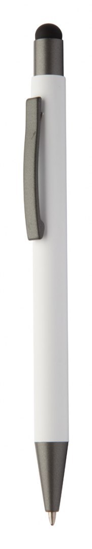 Aluminiowy długopis z końcówką do ekranów dotykowych i gumowanym wykończeniem. Posiada niebieski wkład.