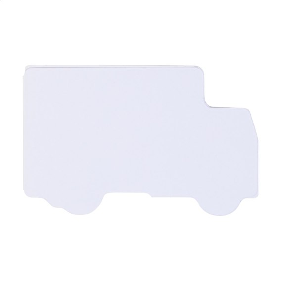 Wykonany na zamówienie notes samoprzylepny w kształcie ciężarówki, oklejony papierem. Zawiera 50 karteczek samoprzylepnych z papieru z recyklingu. Cena obejmuje full kolorowy nadruk na okładce. Min. ilość: 100 szt.