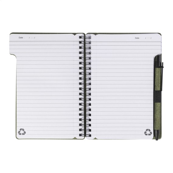 Notes spiralny z papieru z recyklingu, 80 kartek w linie. Format A6. W zestawie papier z recyklingu i długopis z polipropylenu z recyklingu z niebieskim wkładem.