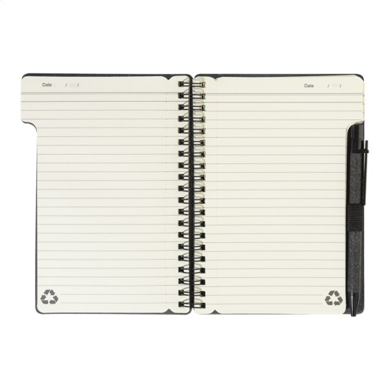 Notes spiralny z papieru z recyklingu, 80 kartek w linie. Format A6. W zestawie papier z recyklingu i długopis z polipropylenu z recyklingu z niebieskim wkładem.