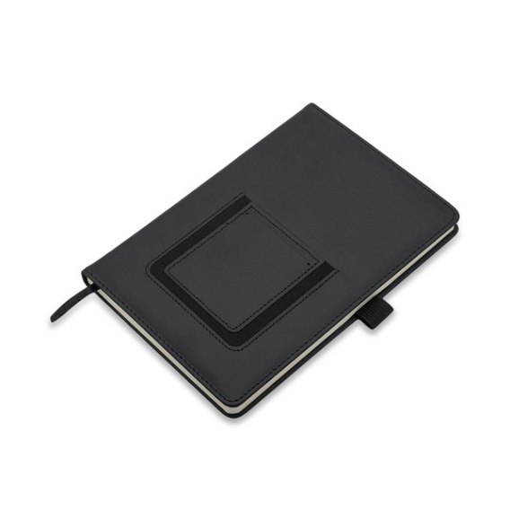 Notes A5 wyposażony w elastyczną kieszeń, która dopasowuje się do wielkości telefonu. Mniejsza kieszonka przeznaczona jest na wizytówki. Twarda oprawa z ekoskóry. 100 kartek w linię, gramatura 80 g/m2. Elastyczny uchwyt na długopis.