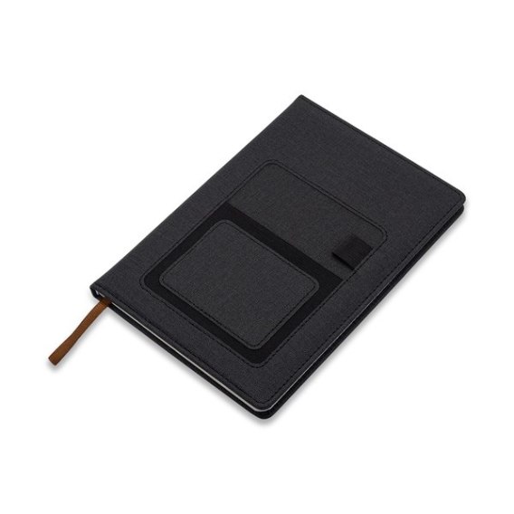Notes wielkości A5 wyposażony w elastyczną kieszeń, która dopasowuje się do wielkości telefonu. Elegancka sztywna oprawa. 80 kartek w linię, gramatura 80 g/m2. Elastyczny uchwyt na długopis.