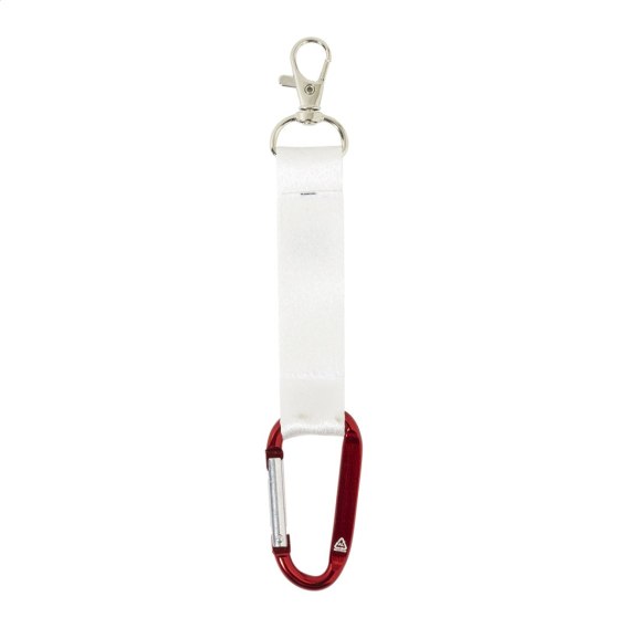 Wykonany na zamówienie mini brelok z poliestru RPET z grafiką nadrukowaną metodą sublimacji po obu stronach. Z małymi metalowymi i dużymi karabińczykami z recyklingowanego aluminium. Min. ilość: 100 szt.