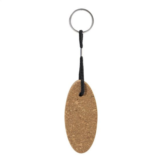 Pływający brelok z naturalnego korka, ze sznurkiem poliestrowym i metalowym kółkiem.