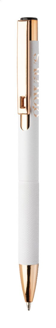 Długopis z recyklingowanego aluminium z matowym wykończeniem, teksturowanym uchwytem i detalami w kolorze różowego złota. Ze specjalną powłoką do lustrzanego grawerowania laserowego w kolorze różowego złota. Z niebieskim wkładem.