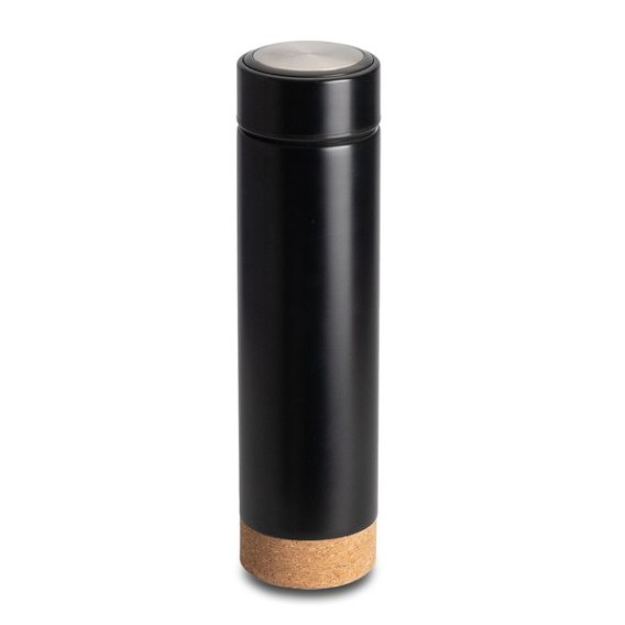 Termos próżniowy o pojemności 450 ml z dwiema metalowymi ściankami, świetnie utrzymujący ciepło, szczelny. Wykonany ze stali nierdzewnej 18/8 o podwyższonej jakości. Urzeka eleganckim połączeniem czerni i korkowej podstawy. Posiada stalowy zaparzacz do herbaty. Utrzymuje temperaturę powyżej 40°C przez 15 godzin.